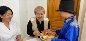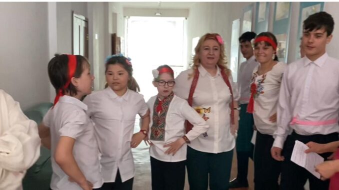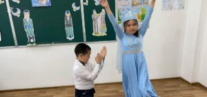 Оқушылар педагогтармен әр түрлі ұлттардың мінезіндегі алаңның сәндік-көркемдік безендірілуін пайдалана отырып, музыкалық-би құттықтауларын ұсынды.