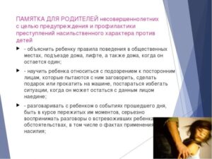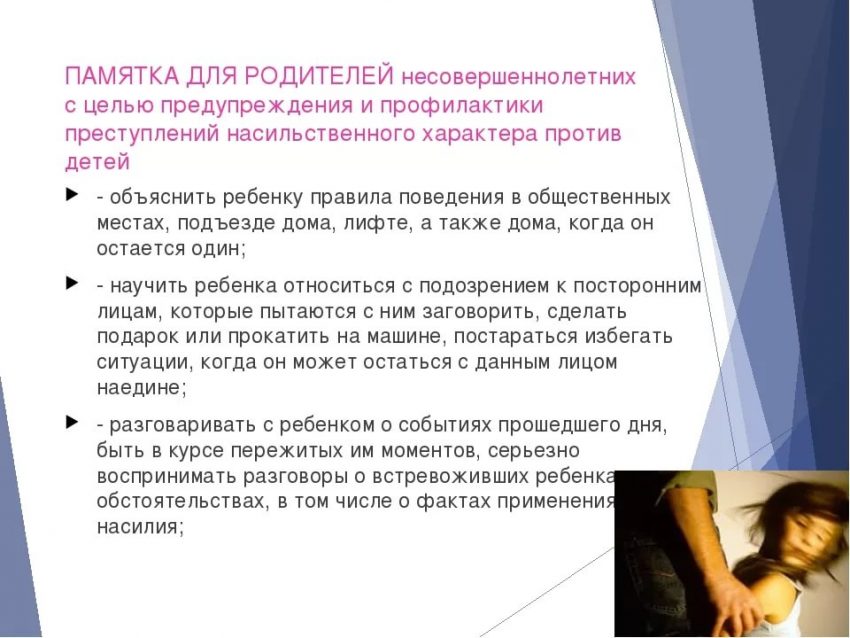 – Кіреберістің жанында, мектеп ауласында, балабақша қоршауының жанында мақсатсыз серуендеп жүрген ер адамдарға мұқият болыңыз. Бұл туралы полицияға хабарлаңыз. Кейде учаскелік қызметкерге ықтимал қылмыскердің ауданнан қалай жоғалып кететінін тексеру жеткілікті. Шабуылдаушы көлік жүргізе алады, ол көлікті мектептің жанына қойып, балаларды бақылайды. Егер сіз күдікті көлікті байқасаңыз, Нөмірді жазыңыз, оның түсін, маркасын есте сақтаңыз, жүргізушінің немесе жолаушының сыртқы түрін есте сақтаңыз. Бұл туралы мектеп директорына хабарлаңыз. – Баланы сабақтан, сыныптастарының компаниясындағы үйірмелер мен секциялардан оралуға шақырыңыз, егер оны жеке кездестіруге мүмкіндік болмаса. – Балаңызға қатысты зорлық-зомбылық қылмыстарының алдын алу мақсатында балабақша тәрбиешісімен, мұғаліммен, балалар мекемелеріндегі психологпен байланыста болыңыз.
