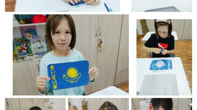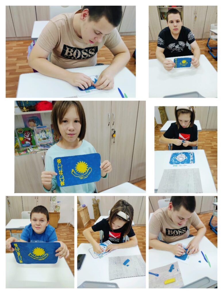 5–6 және 8–10 сынып оқушылары Қазақстан Республикасының Мемлекеттік туына арналған шығармашылық сабаққа белсенді қатысты. Балалар пластилинография техникасын қолдана отырып, ел рәмізін өз қолдарымен бейнеледі.