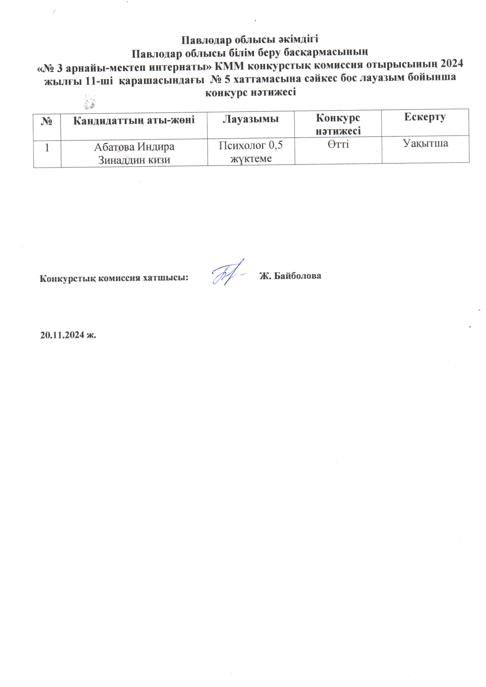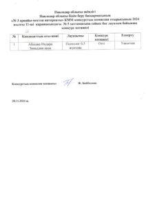 Психологтың бос лауазымына тағайындау конкурсының нәтижесі