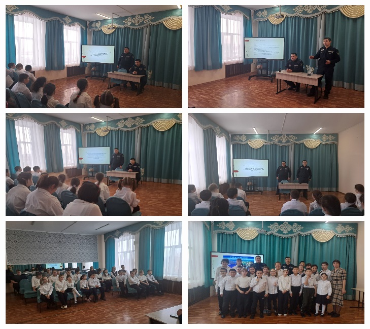 25.02.2025ж «Ақсу қ. ББ ОМПС УИП» полиция капитаны Е. Б. Кощегулов, полиция лейтенанты Б. А. Байтен 5-10 сынып «Кәмелетке толмағандардың қылмыстық жауапкершілігі» тақырыбында оқушыларымен әңгімелесу өткізді.