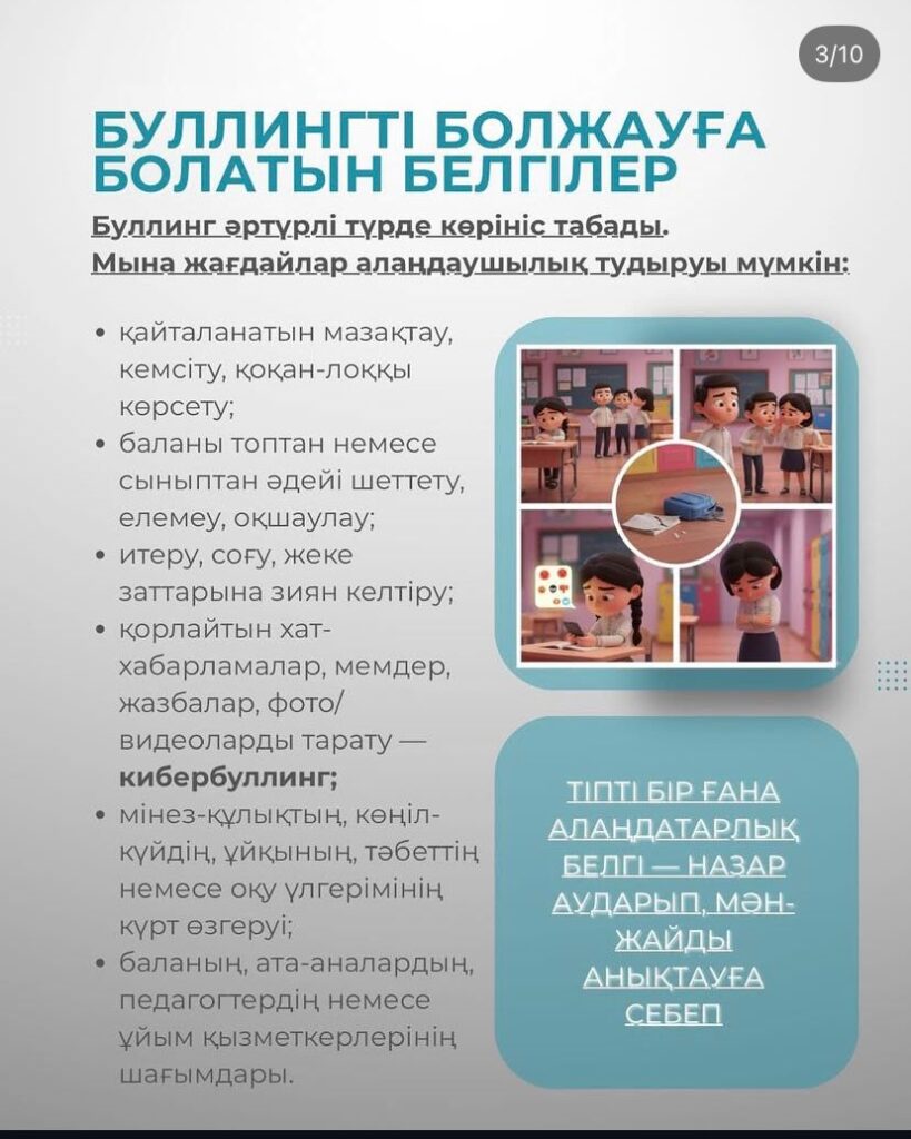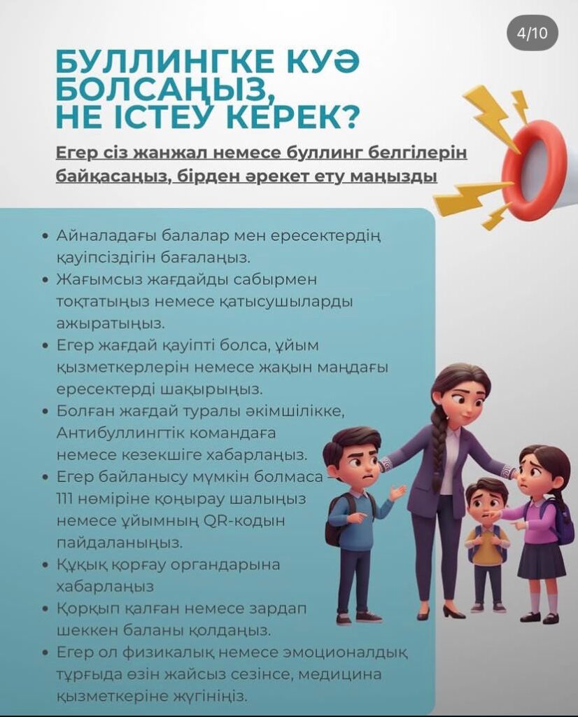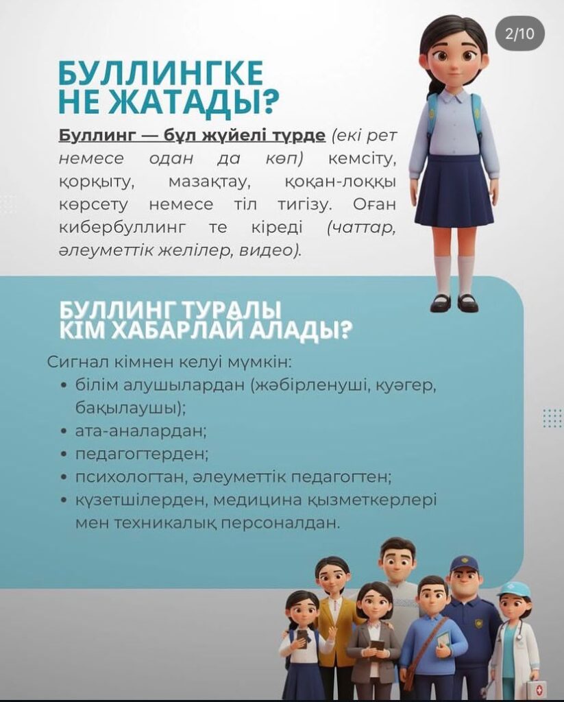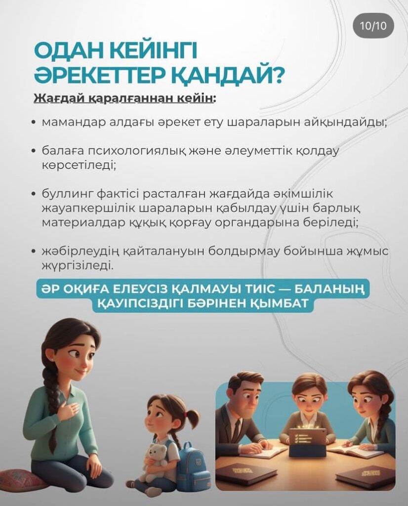 🛡️2022 жылдан бастап елімізде «буллинг» және «кибербуллинг» ұғымдары заңнамалық деңгейде бекітілді. Ал 2024 жылдан бастап бұл әрекеттер үшін әкімшілік жауапкершілік көзделген.