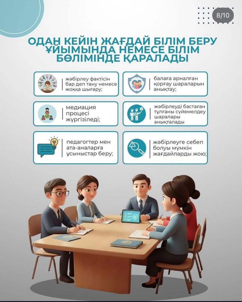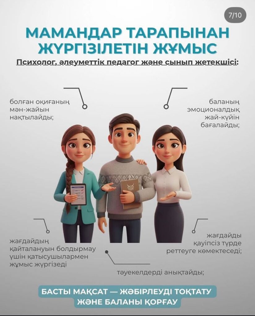 ⤴️ Жоғарыда берілген инфографикада — әрекет ету алгоритмі, құқықтық шаралар және ата-аналарға, педагогтер мен мамандарға арналған нақты ұсынымдар ұсынылған.
