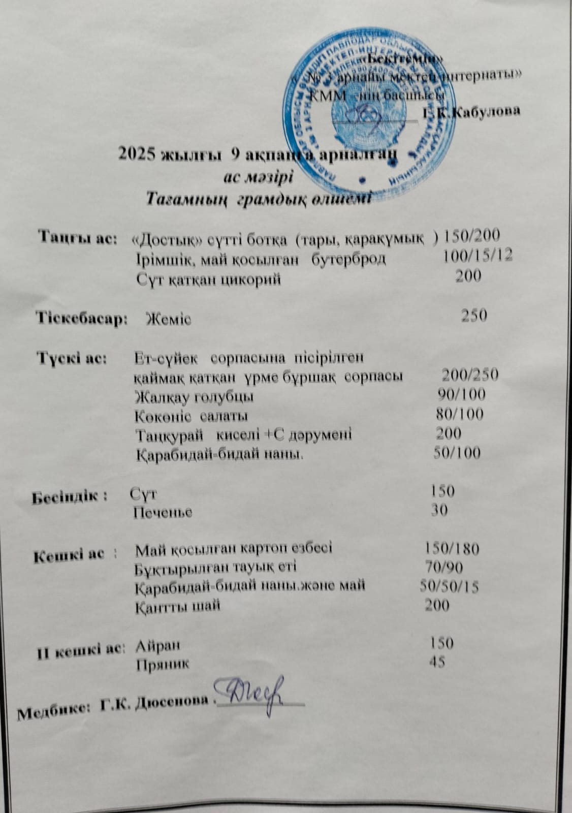 2025 жылғы 9 ақпанға арналған ас мәзірі