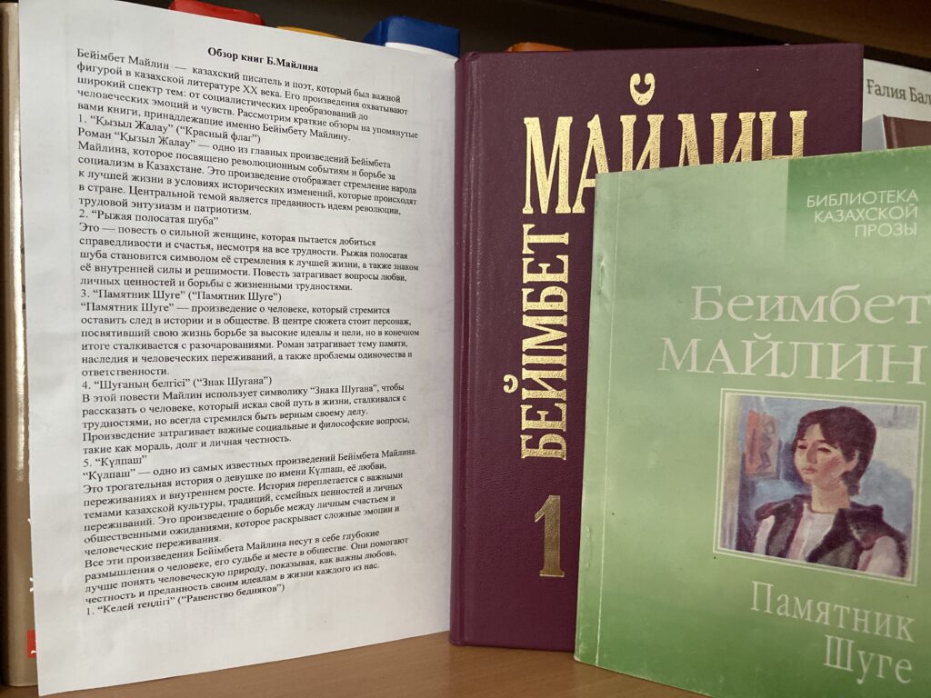 Бейімбет Майлин — казахский писатель, чьи произведения затрагивают важные моральные и исторические темы. К примеру, в рассказах, как «Рыжая полосатая шуба» и «Памятник Шуге», он раскрывает вопросы стремления к богатству и значения памяти.