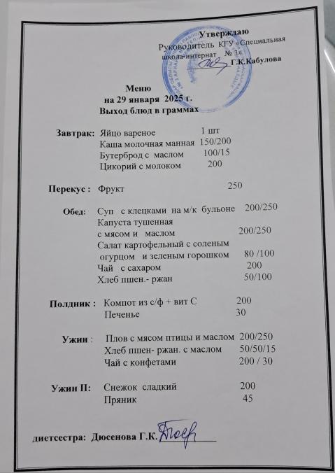 Меню на 29 января 2025 г.