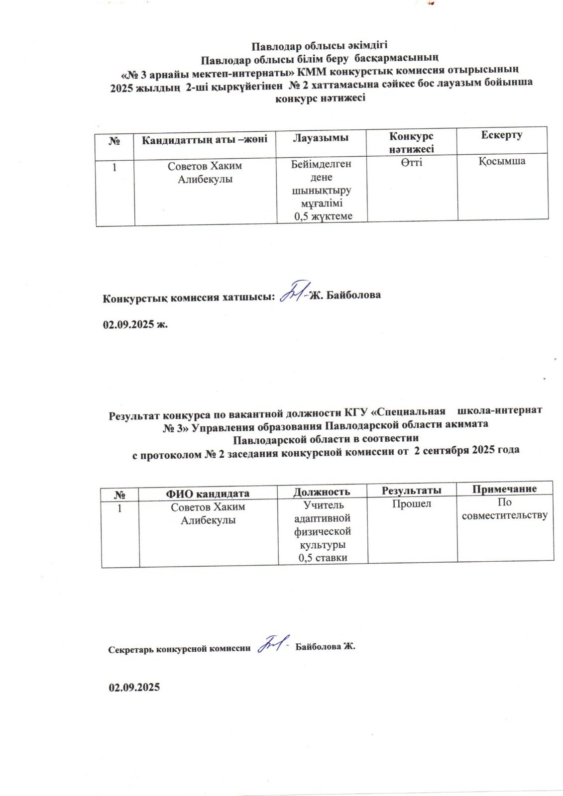 По итогам конкурса на замещение вакантной должности учителя адаптивной физической культуры,