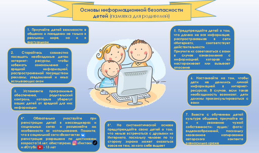 5. Контролируйте ребенка в сети и обучайте его информационной грамотности – дети, особенно дошкольного и младшего школьного возраста не должны оставаться наедине со всемирной паутиной. Находитесь рядом с ребёнком в момент использования сети, объясните детям, что ни в коем случае нельзя использовать Сеть для хулиганства, нецензурной брани, оскорблений, унижений, распространения сплетен и угроз другим людям.