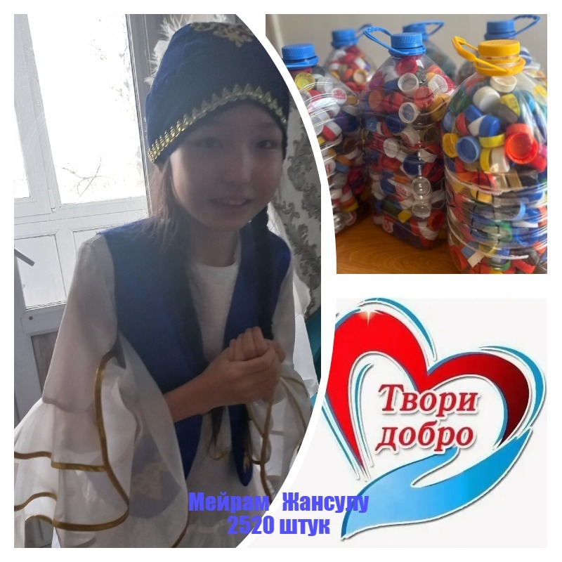 Цель акции — повышение уровня экологической культуры, осознание учащимися своей социальной значимости посредством помощи нуждающимся. Поздравляем Мейрам Жансулу за участие в акции «Твори добро», которая заняла 1 место собрав 2520 пластиковых крышек.